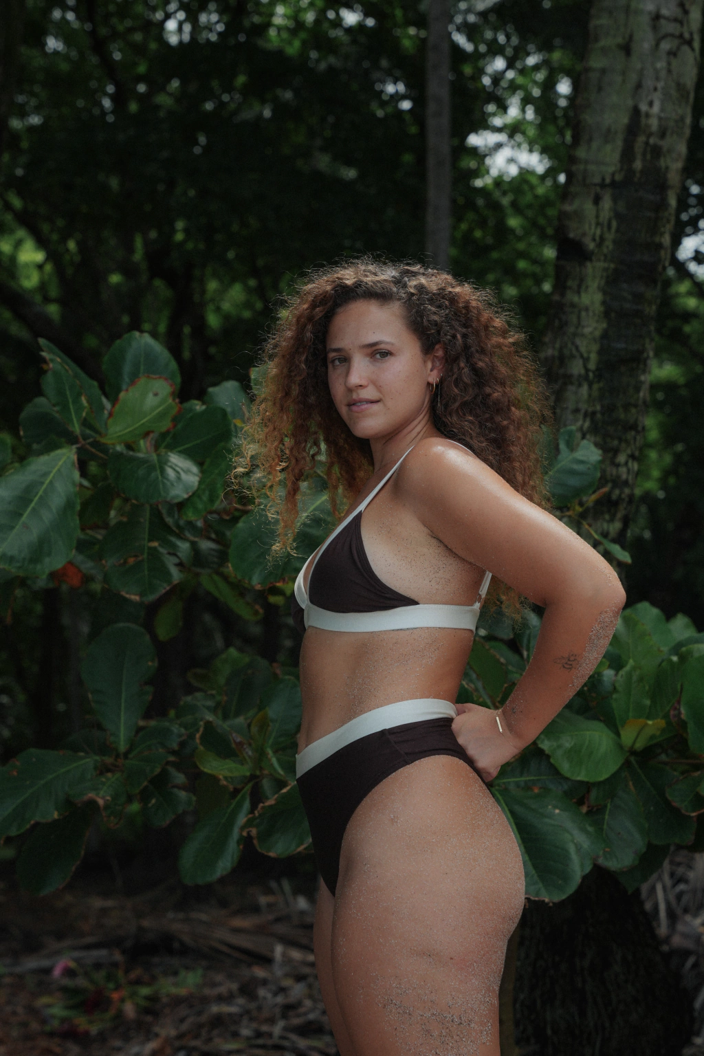 Corpiño: triángulo con tiras embolsadas en el escote. Cuenta con espacio para colocar almohadilla de relleno. Breteles regulables en espalda. Elástico en el bajo busto y espalda.